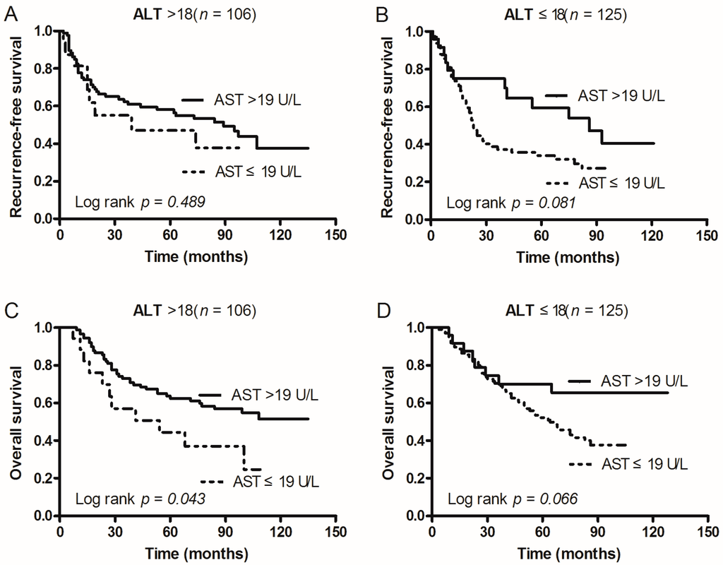Kaplan–Meier survival curves of patients with AST > 19 U/L and AST ≤ 19 U/L grouped by patient subgroups of ALT. (A) In ALT > 18 U/L patients, RFS of patients with AST ≤ 19 U/L was shorter than that of those with AST > 19 U/L (p = 0.489); (B) In ALT ≤ 18 U/L patients, RFS of patients with AST ≤ 19 U/L was shorter than that of those with AST > 19 U/L (p = 0.081); (C) In ALT > 18 U/L patients, OS of patients with AST ≤ 19 U/L was shorter than that of those with AST > 19 U/L (p = 0.043); (D) In ALT ≤ 18 U/L patients, OS of patients with AST ≤ 19 U/L was shorter than that of those with AST > 19 U/L (p = 0.066).