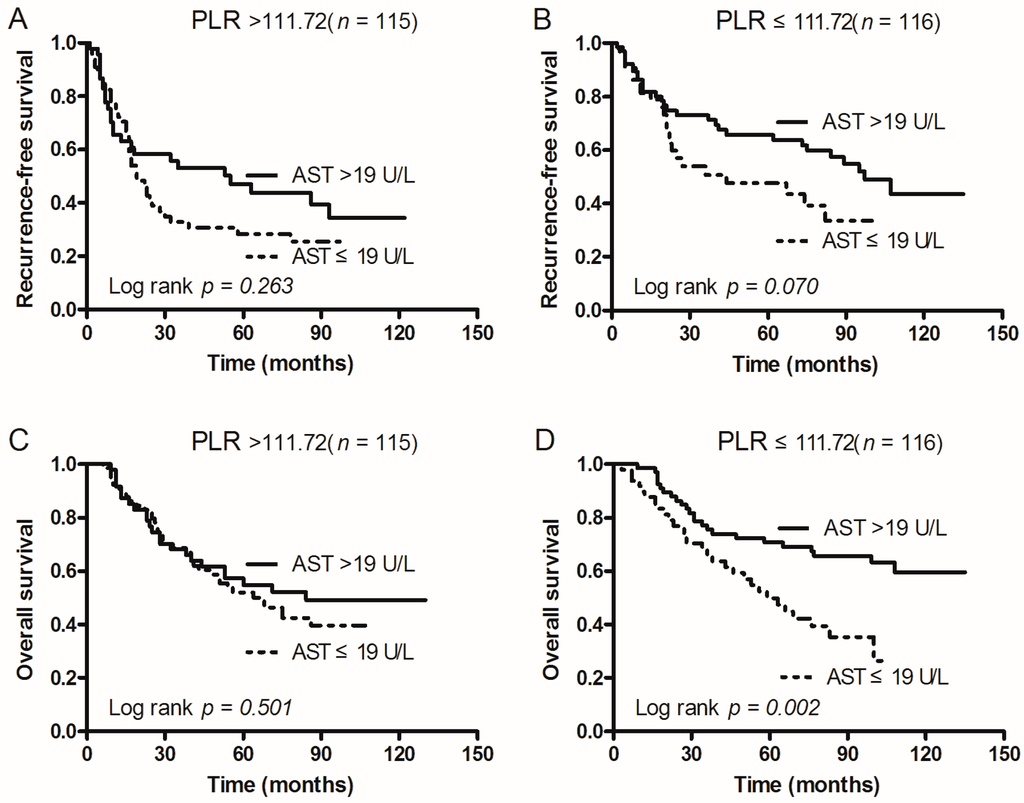 Kaplan–Meier survival curves of patients with AST > 19 U/L and AST ≤ 19 U/L grouped by patient subgroups of PLR. (A) In PLR > 111.72 patients, RFS of patients with AST ≤ 19 U/L was shorter than that of those with AST > 19 U/L (p = 0.263); (B) In PLR ≤ 111.72 patients, RFS of patients with AST ≤ 19 U/L was shorter than that of those with AST > 19 U/L (p = 0.070); (C) In PLR > 111.72 patients, OS of patients with AST ≤ 19 U/L was shorter than that of those with AST > 19 U/L (p = 0.501); (D) In PLR ≤ 111.72 patients, OS of patients with AST ≤ 19 U/L was shorter than that of those with AST > 19 U/L (p = 0.002).
