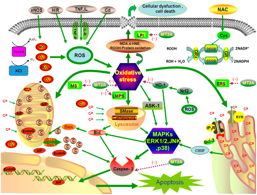 MT2A is intimately associated with oxidative stress, mediated by subcellular pathways of mitochondria, ER, lysosomal, and lipidosome, as well as MAPKs (ERK, JNK and p38) signals.
