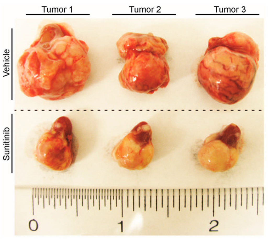 Cancer cells are defined by their heterogeneity and genetic instability [17], evolutionary biology teaches us that a selection pressure triggers reactionary dynamics and natural selection will produce a resilient system. Hence, antiangiogenic therapy or namely anti-VEGF therapy works upon cancer cells as a selection pressure and the surviving cells acquire an advantage in the new environment. An example of antiangiogenic compound used in the clinic is sunitinib, a small-molecule multi-targeted TKR inhibitor (TKI). Sunitinib is a FDA approved drug for renal cell carcinoma and for Imatinib (IM)-resistant (another TKI) gastrointestinal stromal tumors (GISTs). Figure 1 shows a sunitinib treated murine renal cancer (RENCA), where antiangiogenic treatment leads to noticeably less vascularized tumors. The resulting hypoxic tumor microenvironment is composed by normal fibroblasts, immune and ECs among others, which may play a major role in tumor growth and progression. Therefore, another potential mechanism of resistance to antiangiogenic therapies may result from growth signals provided by the microenvironment [18,19,20].