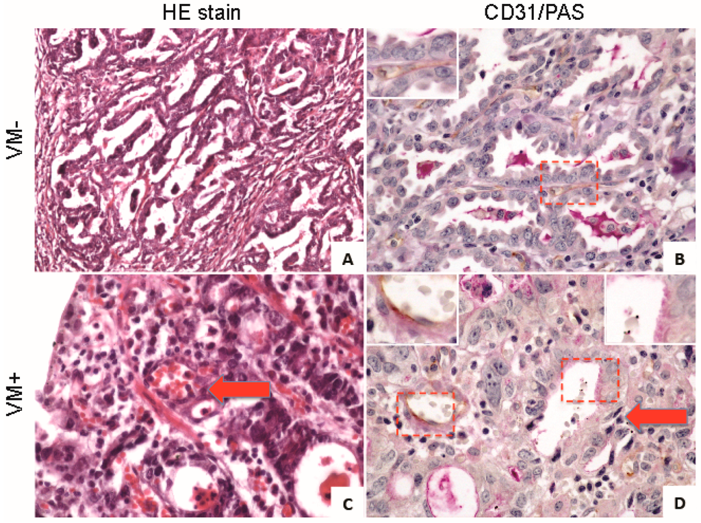 In a meta-analysis of 22 clinical studies, encompassing 3062 patients across 15 cancer types, the five-year overall survival of VM+ and VM− cancer patients was 31% and 56%, respectively. Accordingly, the calculated relative risk of failure to achieve five-year survival in VM+ patients was significantly higher than that of VM− [83]. Interestingly, in all cancer types analyzed to date, the presence of VM is reported in fewer than 50% of cases and may thus be representative of a common aggressive malignant sub-class or phenotype. In osteoblastic-type osteosarcomas, the presence of VM was detected in 22.7% (15 of 66) of tumors. This incidence negatively correlated with both metastasis-free and overall survival, but was independent of patient sex, age, surgical type or tumor size [84]. Two histological analyses demonstrated the same percentage on VM formation in ovarian cancer. One study reported 52 (43%) out of 120 carcinomas analyzed were VM+ [85]. A previous study reported 43% (36 of 84) of analyzed ovarian carcinomas were VM+, within this group VM+ patients displayed significantly elevated levels of pathologic grade, histological type and poor survival [86]. Similarly, VM was detected in 35% of triple-negative breast cancers (TNBC) as opposed to 17.8% in non-TNBCs. In gastric adenocarcinoma, tubular networks were observed in 40 of 173 (22%) patients, with statistically elevated correlation with poorly differentiated tumors [87]. Figure 2 shows gastric adenocarcinoma samples from a negative (VM−, Figure 2A,C) and a positive (VM+, Figure 2B,D) patient for tubular networks stained with hematoxylin and eosin (HE; Figure 2A,C) and with a dual CD31 (brown)/PAS (violet) stain to identify EC vessels. Red arrow in Figure 2C shows a vessel that contains red blood cells in its lumen. In Figure 2D, red arrow highlights a CD31− vessel within a tumor gland that contains red blood cells, representing VM+ vessels seen in detail in the upper right inset, in contrast upper left inset shows a traditional (CD31+) used as a control. VM has also been identified in rhabdomyosarcomas, prostatic carcinomas, soft tissue sarcomas, glioblastomas, liver carcinomas and osteosarcomas among many other malignancies [88]. Thus, conventional therapeutic regimens that target angiogenesis alone may in the long-term be ineffective against a high percentage of invasive tumors capable of undergoing VM and thus presenting heterogeneous microcirculation.
