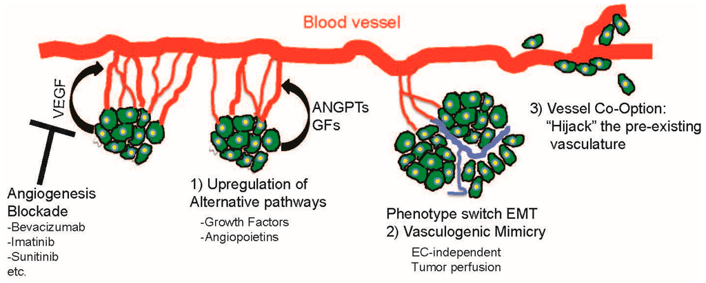 The methods of escape are numerous and may include: vascular heterogeneity, influence of the cancer stroma, stress adaptation, and alternative vascularization methods such glomeruloid angiogenesis, looping angiogenesis and intussusceptive growth [21,22]. In this mini-review, we will focus and discuss in detail recent advances on three main mechanisms of antiangiogenic therapy escape: upregulation of compensatory pathways, the process of vasculogenic mimicry (VM) and the concept of vessel (or vascular) co-option (VCO).