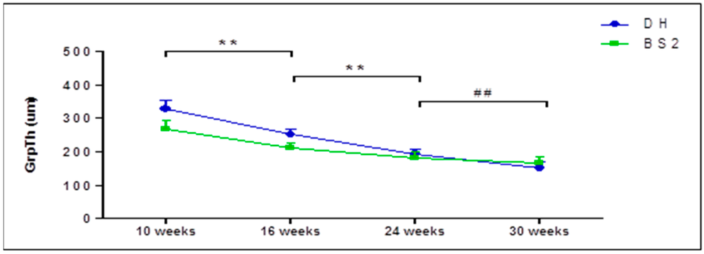 Growth plate thickness (GrpTh) of the proximal tibial epiphysis of DH and BS2 at four different time points. GrpTh was compared between the successive time points (Kruskal-Wallis test). A significant difference of p ≤ 0.01 in both strains was denoted as **, while p ≤ 0.01 only in DH was denoted as ##. Error bars represent the 95% CI.