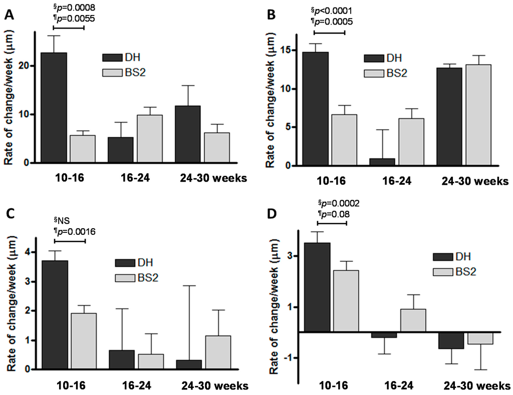Rate of change in subchondral bone thickness of DH and BS2 guinea pigs for intervals 10–16, 16–24 and 24–30 weeks. (A) Medial SbpTh; (B) lateral SbpTh; (C) medial TbTh and (D) lateral TbTh. The rate of change in subchondral bone thickness between strains over time intervals were ranked and compared using 1-way ANOVA § and Student t-test ¶. The p-values shown are for the earliest time point only.