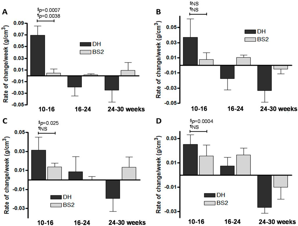 Rate of change in subchondral BMD of DH and BS2 guinea pigs for intervals 10–16, 16–24 and 24–30 weeks. (A) Medial Sbp BMD; (B) lateral Sbp BMD; (C) medial Tb BMD and (D) lateral Tb BMD. The rate of change in subchondral bone BMD between strains over time intervals were ranked and compared using 1 way ANOVA § and Student t-test ¶. The p-values shown are for the earliest time point only.
