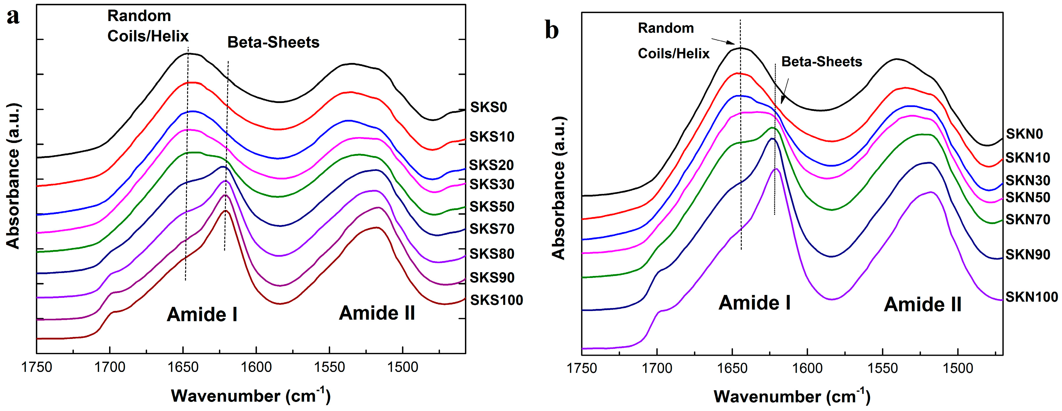 | Sample | Silk Fraction in Sample (%) | β-Sheet Crystallinity (B) | α-Helix & Random Coils (A + R) | Turns (T) | Side Chains (S) |