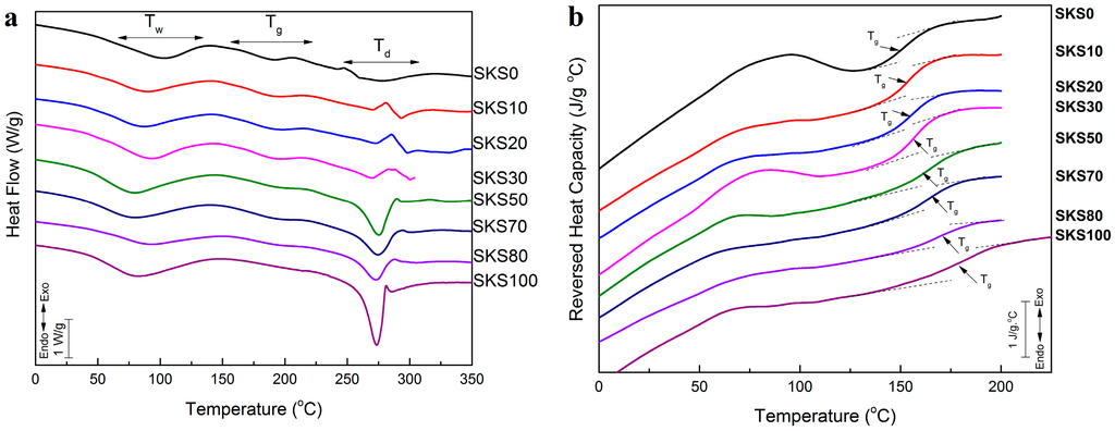 | Sample | Glass Transition Temperature (°C) | ∆Cp (J·g−1·°C−1) | Degradation Peak (°C) |