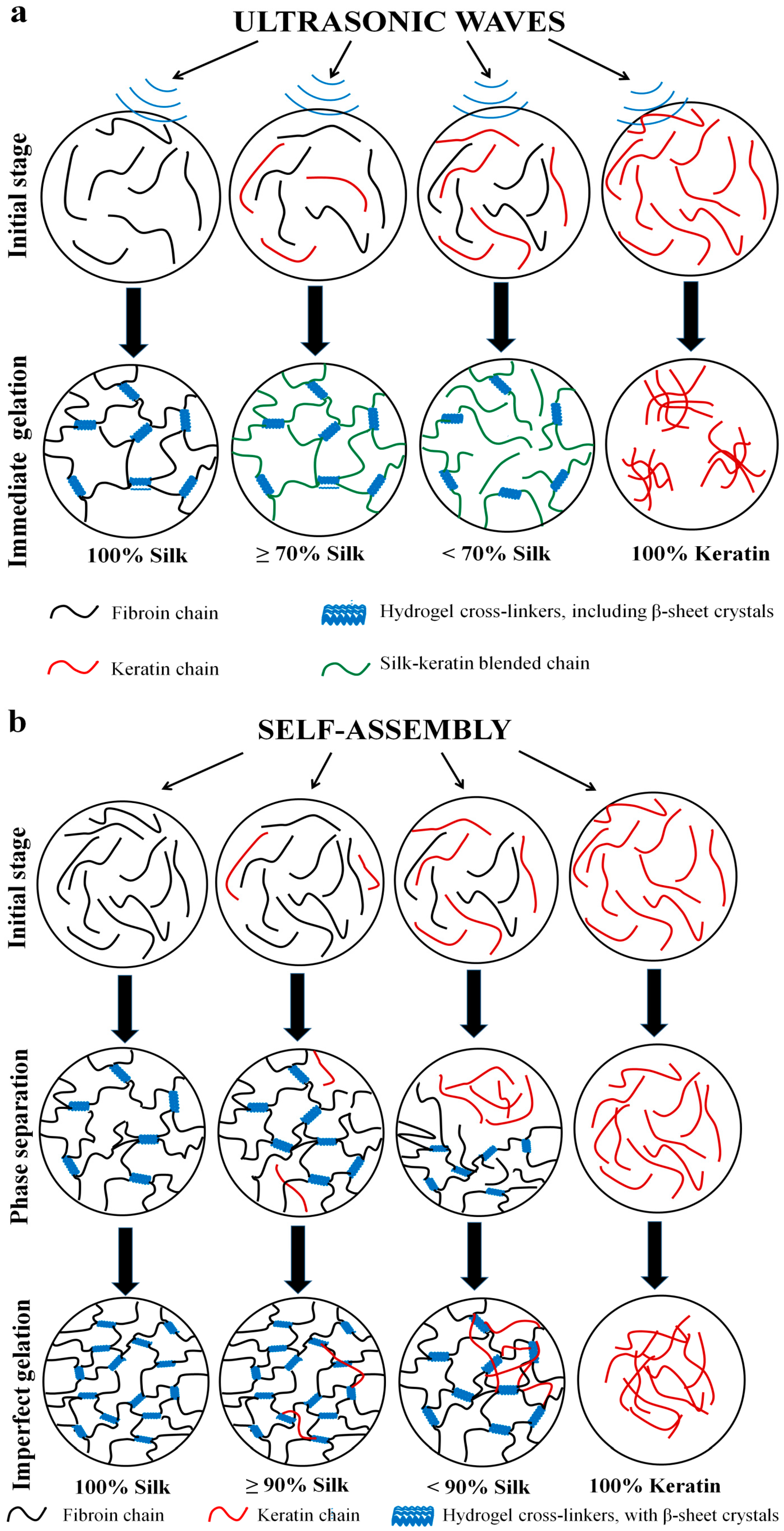 Comparative Study of Ultrasonication-Induced and Naturally Self-Assembled Silk Fibroin-Wool Keratin Hydrogel Biomaterials