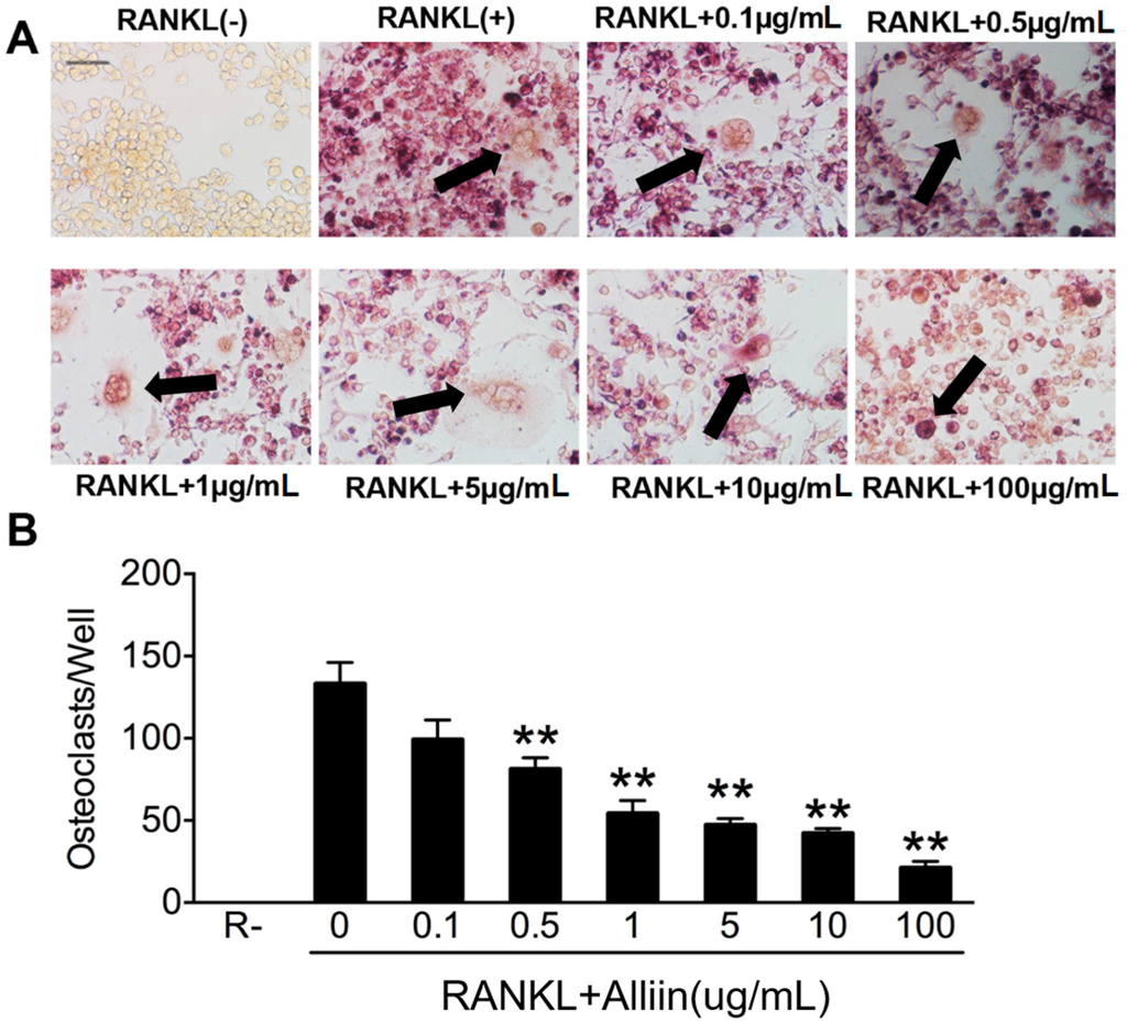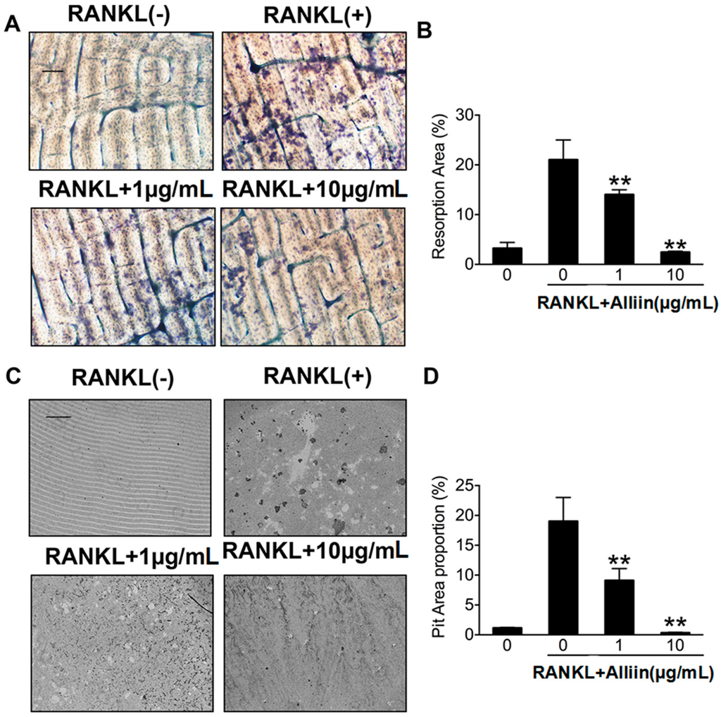 2.3. Alliin Inhibits RANKL-Induced Osteoclastic Bone Resorption
