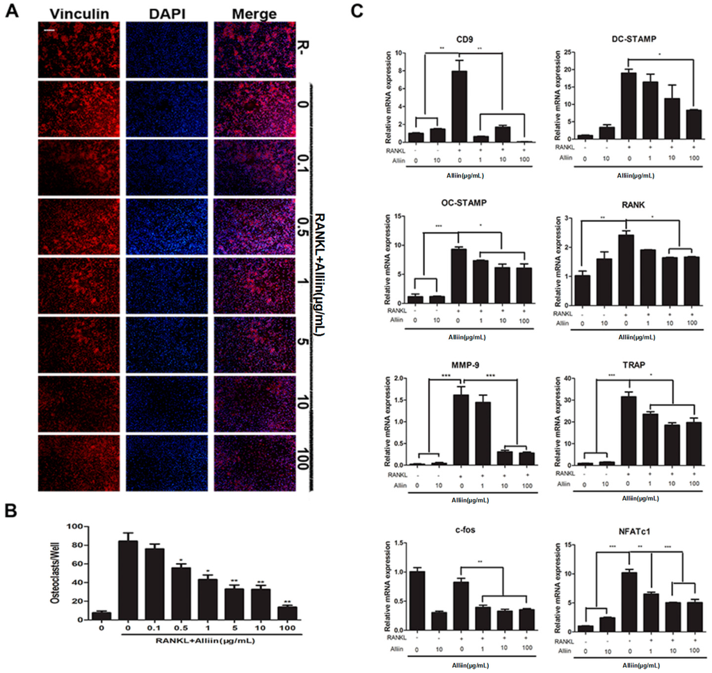 2.2. Inhibitory Effect of Alliin on Osteoclast Differentiation and Fusion in RANKL-Induced Osteoclastogenesis
