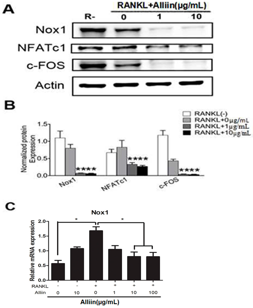 Chen, Y.; Sun, J.; Dou, C.; Li, N.; Kang, F.; Wang, Y.; Cao, Z.; Yang, X.; Dong, S. Alliin Attenuated RANKL-Induced Osteoclastogenesis by Scavenging Reactive Oxygen Species through Inhibiting Nox1. Int. J. Mol. Sci. 2016, 17, 1516. https://doi.org/10.3390/ijms17091516