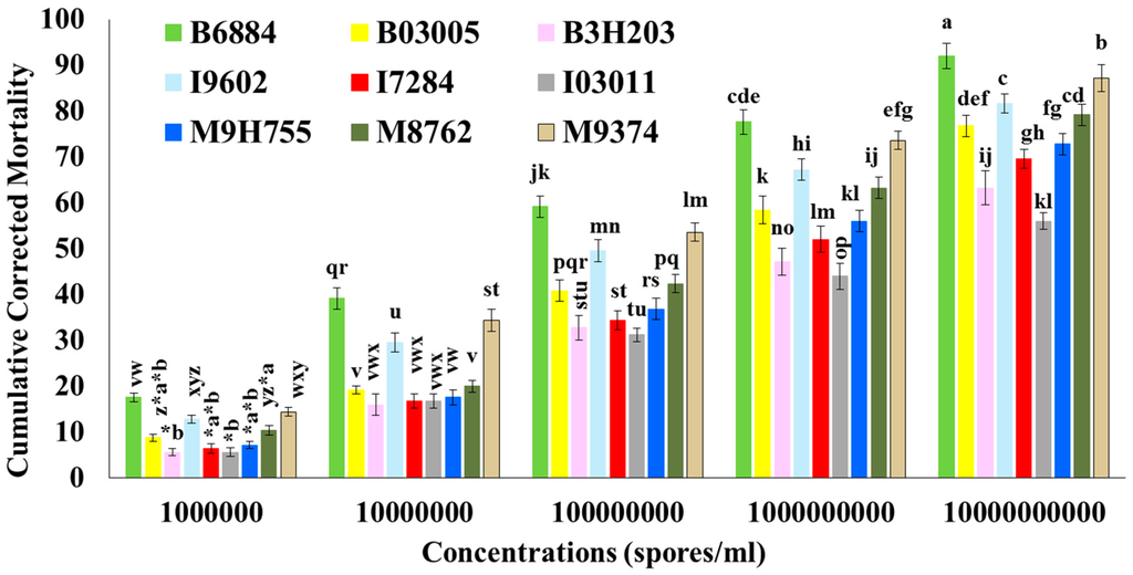 | M. anisopliae 9H755 | 10.14 ± 0.33 b | 6.40 ± 0.98 i | 23.20 ± 1.50 f | 56.00 ± 2.53 c |