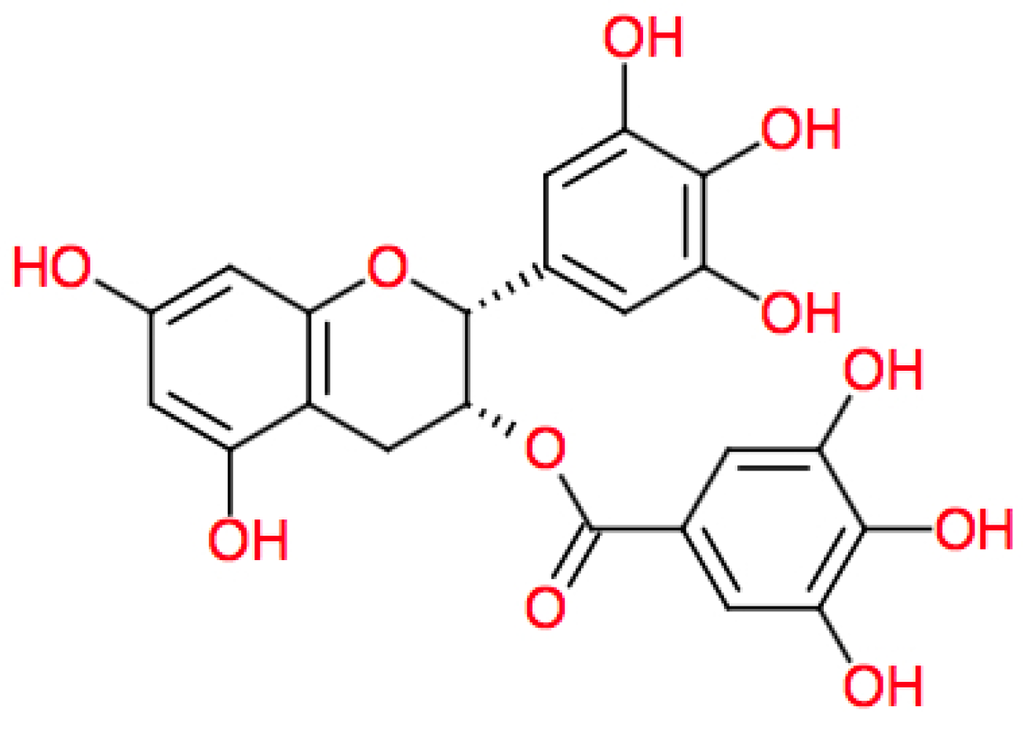 Chemical structure of (β)-epigallocatechin-3-gallate (EGCG).