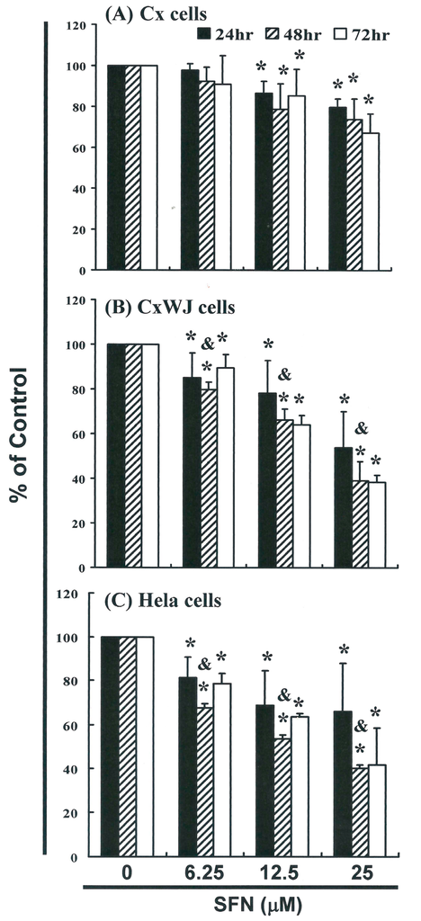 SFN inhibits the survival of cervical (A) Cx; (B) CxWJ and (C) HeLa cancer cell lines, thereby inhibiting proliferation. Cancer cell lines were treated with increasing doses of SFN (0, 6.25, 12.5 and 25 μM) for 24 to 72 h, and cell survival was quantified using the MTT method. Results were expressed as a percentage of the control, which was considered to be 100%. All data are reported as the mean (±SEM) of at least three separate experiments. Statistical analysis was performed using a t-test, with differences considered significant at a level of p < 0.05. (The * symbol indicates that results were significant versus the control group, and the & symbol indicates that results were significant versus the 24 h group).