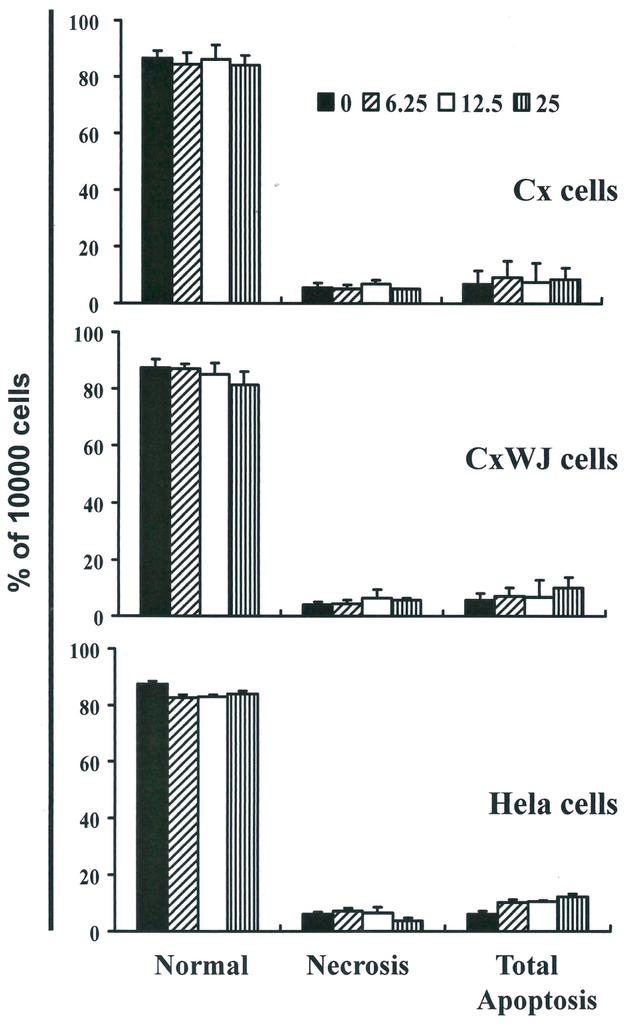 Total apoptosis and necrosis in cervical cancer cell lines after 4 h of incubation with SFN (0, 6.25, 12.5, and 25 μM). Results are expressed as a percentage of control group cells, necrosis, and total number of apoptotic cells (including both early and late apoptosis).