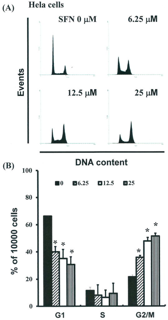 Influence of SFN on cell cycle progression/distribution in HeLa cells: (A) Cell cycle analysis of HeLa cells cultured with SFN for 24 h; (B) SFN induced an increase in G2/M phase cells and a decrease in G1 phase cells (results are expressed as percentages). The * symbol in each group of bars indicates that differences resulting from treatment with SFN 0 µM were statistically significant at p < 0.05.