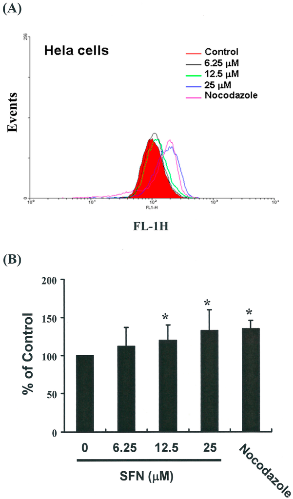 Influence of SFN on MPM-2 (anti-phospho-Ser/Thr-Pro) expression in untreated and treated cancer cells. MPM-2 is an antibody that recognizes proteins which are only phosphorylated during mitosis. Cells were dually stained using propidium iodide to analyze DNA content, and protein expression was quantified by flow cytometry. As a positive control, separate groups of cells were treated with nocodazole for 24 h (15 μg/mL), an anti-fungal agent known to induce metaphase arrest. (A) MPM-2 expression (gated cells) was measured by flow cytometry following treatment with SFN for 24 h; (B) SFN enhanced the level of MPM-2 in HeLa cells. The * symbol in each group of bars indicates that differences resulting from treatment with SFN 0 μM were statistically significant at p < 0.05.