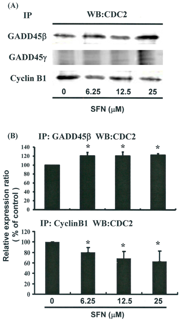 Figure 5A illustrates the expression of cyclin B1 and GADD45 family mRNA genes. Figure 5C provides immunoblots of cellular proteins from HeLa cells treated with SFN. Gene expression and Western blot analysis revealed that cyclin B1 decreased following incubation with SFN (Figure 5A–C). Western blotting (Figure 5C) also revealed that SFN treatment was associated with a decrease in cyclin B1 protein expression in HeLa cells. Co-IP further demonstrated that the GADD45β/CDC2 complex had formed (Figure 6A,B) (y = 6.8638x + 98.995, R2 = 0.6716), but the GADD45β/Cyclin B1 complex had not (data not shown). Expression of Cyclin B1 proteins was quantified by measuring relative band intensities (y = −6.7396x + 102, R2 = 0.733) (Figure 5C). This analysis further confirmed that cyclin B1/CDC2 complex levels were significantly lower in cells that had been incubated with SFN (Figure 6A,B) (y = −12.179x + 108.55, R2 = 0.9358).