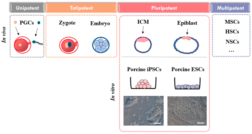 Stem cell state in vivo and in vitro. PGCs: Primordial germ cells, ICM: inner cell mass, iPSCs: induced pluripotent stem cells, ESCs: embryonic stem cells, MSCs: Mesenchymal stem cells, HSCs: Hematopoietic stem cells, NSCs: Neural stem cells. Scale bars = 50 µm.
