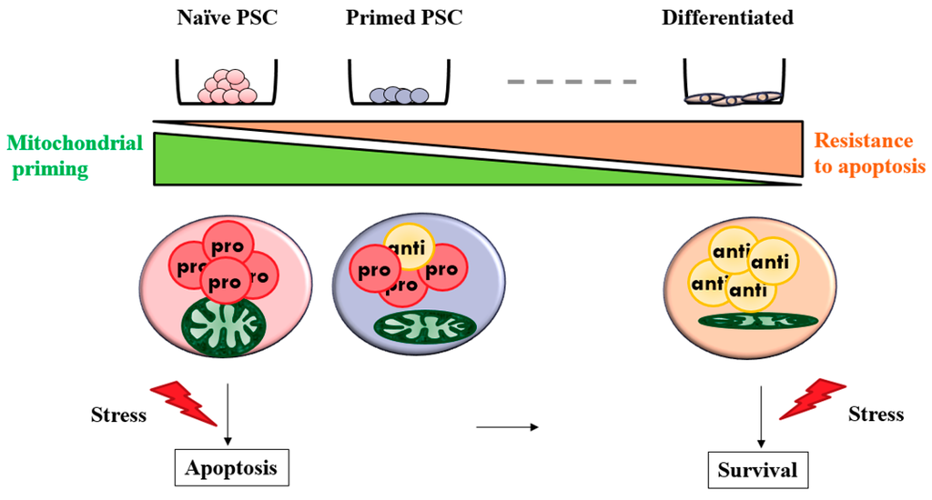 Mitochondrial priming and apoptosis in pluripotent stem cells. PSC; Pluripotent stem cells, Differentiated; differentiated cells, Pro; pro-apoptotic factors, Anti; anti-apoptotic factors.