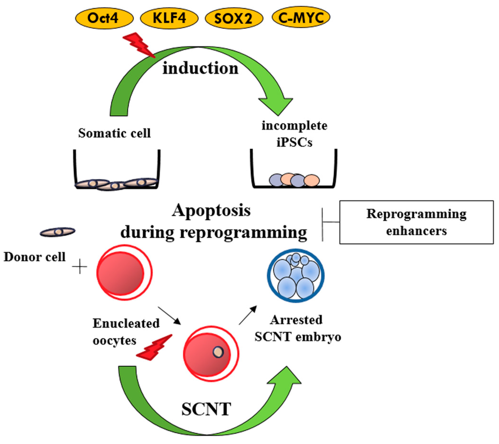 Apoptosis during reprogramming. iPSCs: induced pluripotent stem cells, SCTN: somatic cell nuclear transfer.