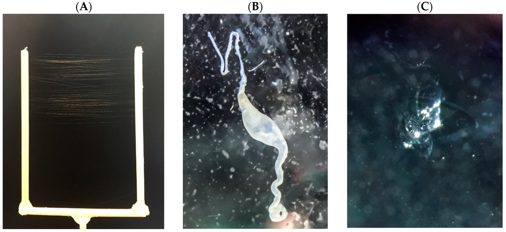 Isolation of dragline silk and major ampullage (MA) gland from L. hesperus: (A) digital photograph of dragline silk wrapped on a Y-apparatus; (B) light microscope image of a single MA gland shown at 10× magnification; and (C) clear viscous spinning dope (center).