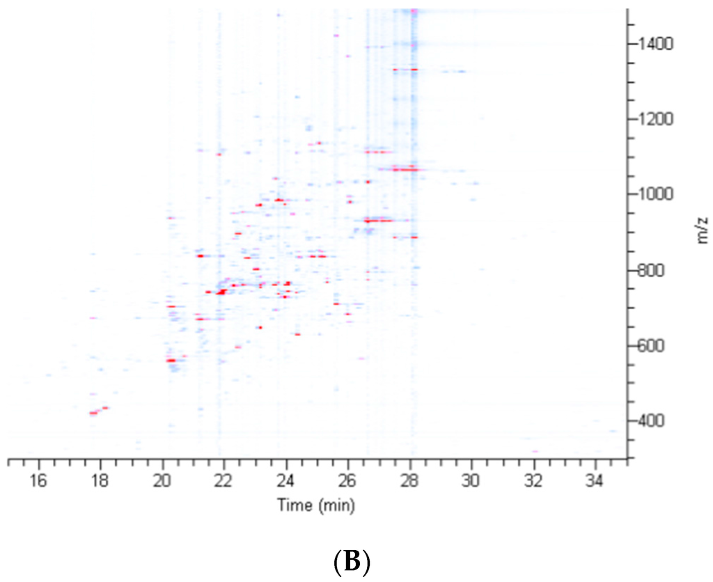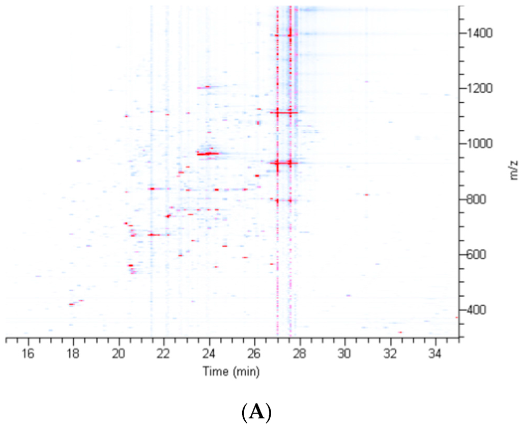Density map of in-solution tryptic digestion products obtained from dragline silk treated with different chemical solvents: (A) hexafluoroisopropanol (HFIP); and (B) urea. The X-axis reveals the retention time (min) for the precursor ions eluted during nano-LC MS analysis, while the Y-axis shows the m/z values (z = +2 to +8). The Z-axis (color) is intensity, normalized to 2.0 × 107 arbitrary units.