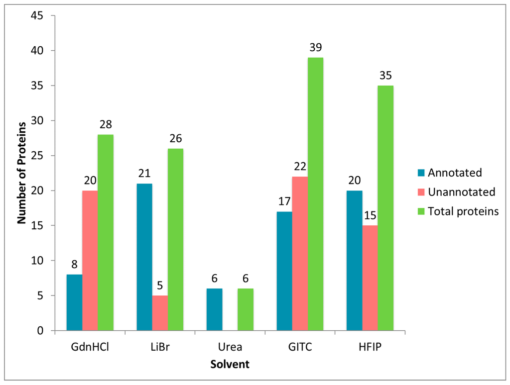 3.2. Proteomic Analysis with Different Chemical Solvents