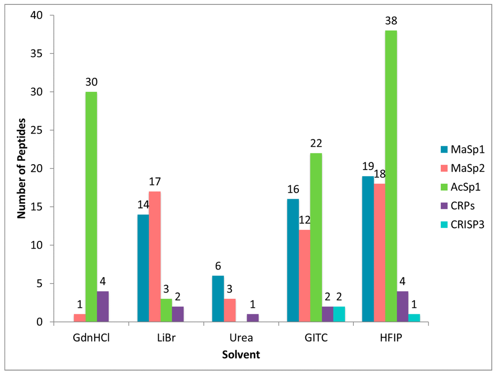 Limited numbers of proteomic studies using mass spectrometry have been performed on dragline silk and silk-producing glands. One study has led to the identification of a low molecular cysteine-rich protein 1 (CRP1) as a component of dragline silk [10]. In addition, a recent proteomic study has suggested that aciniform spidroin 1 (AcSp1) is a constituent of dragline silk, which has been further supported by its presence in the MA gland [9]. These findings suggest that spiders alter the mechanical properties of their fibers by changing silk gene expression and silk protein composition. In our studies, we employed a wide range of solvents that have different chemical and physical properties to dissolve dragline silk, its spinning dope, and the MA gland, followed by comprehensive proteomic analyses using the products from in-solution tryptic digestions to improve our understanding of the mechanism of silk assembly and fiber composition. Collectively, our studies are designed to help advance the silk community’s understanding of the protein constituents present within dragline silk. These findings have implications for scientists that are interested in large-scale production of synthetic dragline silk from recombinant protein sources, as they provide a basic recipe for artificial fiber production.