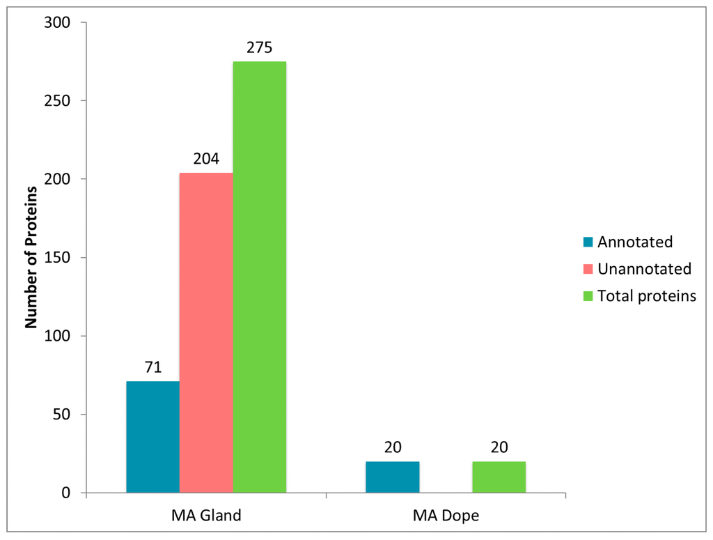 Because HFIP was one of the most effective solvents at dissolving dragline silk and it generated robust protein identification, we investigated protein composition of the MA glands and its spinning dope after HFIP treatment. For these studies, a single female black widow spider was dissected to remove both MA glands (two are present in one individual), dissolving one in HFIP, while the other was used to isolate its spinning dope. The advantage of testing the spinning dope is that it exclusively represents fluid stored in the ampulla and lacks the epithelial cells that are present within the tail region of the MA gland. Although the epithelial cells in the tail region represent the major site of synthesis for fiber materials, these cells also contain proteins involved in metabolism, protein synthesis and other basic cellular activities. As anticipated, the total number of proteins identified with the MA gland surpassed the total number of proteins present within the spinning dope (Figure 5). Seventy-one unique protein accession numbers (annotated) were identified from the HFIP-treated MA gland after tryptic digestion and MS/MS analysis, while 20 unique protein accession numbers were identified in the spinning dope (Figure 5). Many of the proteins identified in the MA gland could be classified as proteins involved in protein folding, protein synthesis, energy production, or spidroin family members (Figure S3). Many unannotated proteins in the MA gland likely fall under the classification of factors involved in cellular metabolism.