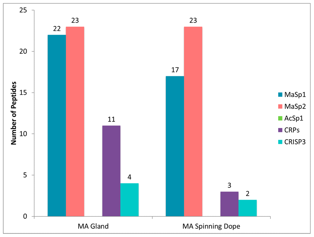 Total number of peptides identified that match either of the major ampullate spidroins (MaSp1 and MaSp2), aciniform spidroin 1 (AcSp1), any of the cysteine-rich protein family members (CRPs), or cysteine-rich secretory protein 3 (CRISP3) from dragline silk.