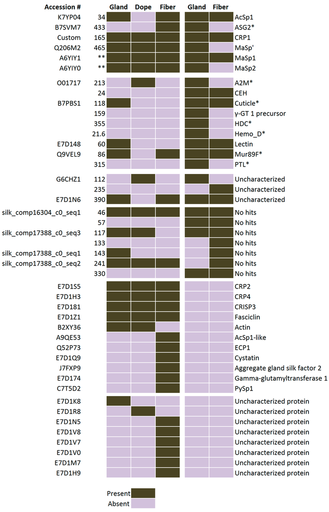 Chart of presence (black) or absence (light purple) of proteins that are predicted within the MA gland, dope and fiber. Two proteomic data sets are available from L. hesperus for comparative purposes. The left panel (gland, dope, and fiber) were conducted with an Orbitrap Fusion™ Tribrid™ mass spectrometer with five different solvent treatments and three modes of peptide ion dissociation, CID, HCD, and ETD, while the right panel (gland, and fiber) was conducted using a LTQ Orbitrap Velos™ mass spectrometer and one mode of ion dissociation, CID [9]. Accession numbers, scaffolding IDs, and silk specific transcripts (SSTs) are listed on the left [9]. Custom indicates the sequence was added into the database manually. No hits indicate the sequences do not match anything in the databases. * Indicate some peptide sequences that were derived from SSTs that are uncharacterized in L. hesperus, but are thought to be homologous to known proteins in different species [9]; ** Indicate protein types with more than one predicted protein [9].