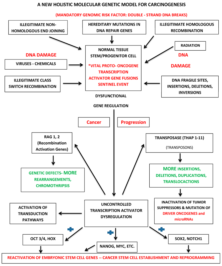Holistic molecular genetic paradigm for cancer initiation and progression. * The sentinel event in cancer occurs when a double-strand break is introduced into DNA at the site of a proto-oncogene transcription activator within a normal tissue stem or progenitor cell resulting in the subsequent production of a chimeric oncogenic protein with novel gene regulatory properties. The blue shape (+): vital oncogenes constitutively activate stem cell maintenance genes such as OCT3/4, HOX, NANOG, MYC, SOX2 and NOTCH1.