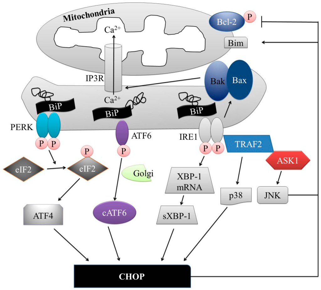 UPR mechanism. Upon the aggregation of the unfolded proteins, binding-immunoglobulin protein (BiP) dissociates from inositol requiring protein-1 (IRE1), protein kinase RNA-like ER kinase (PERK), and activating transcription factor-6 (ATF6), allowing their activation. Activated IRE1 splices X-box-binding protein 1 (XBP-1) mRNA, producing spliced XBP-1 (sXBP-1) that translocates to the nucleus and regulates the expression of C/EBP homologous protein (CHOP) transcription factor. IRE1 can recruit tumor necrosis factor receptor (TNFR)-associated factor-2 (TRAF2) and apoptosis-signaling-kinase 1 (ASK1), resulting in the downstream activation of c-Jun N-terminal protein kinase (JNK) and p38 mitogen-activation protein kinase (MAPK). Activated p38 MAPK phosphorylates and activates CHOP, whereas JNK translocates to the mitochondrial membrane, inhibiting B-cell lymphoma 2 (Bcl-2) and activating Bcl-2 interacting protein (Bim). IRE1 can activate Bcl-2 associated X protein (Bax) and Bcl-2 homologous antagonist killer protein (Bak) that induce inositol 1,4,5-triphosphate receptors (IP3Rs) to initiate the release of Ca2+ from the ER. Activated PERK phosphorylates eukaryotic initiation factor 2 (eIF2), which allows the translation of ATF4 through an eIF2-independent pathway, and ATF4 translocates to the nucleus and stimulates the transcription of proteins required to regain ER homeostasis. ATF6 is activated by the Golgi resident enzymes through a limited proteolysis, and it regulates the expression of CHOP. During the ER stress, all three UPR pathways result in the initiation of CHOP transcription.