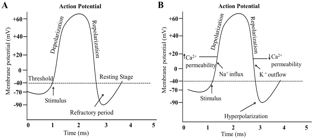Ionic basis of action potential. (A) A typical action potential. The membrane potential begins at −70 mV. When a stimulus is applied after 1 ms, the membrane potential raises above −40 mV (threshold potential). If a prolonged stimulation is applied, the membrane potential rapidly rises to the peak potential (+60 mV) at time = 2 ms. Afterward, the potential rapidly drops and overshoots to −90 mV at time = 4 ms, and finally the resting potential of −70 mV is reestablished at time = 5 ms; (B) the role of Ca2+ during an action potential. Depolarization occurs due to the influx of Na+ ions, which causes voltage-gated Ca2+ channels to open. This results in the change of membrane potential first from −70 mV to −40 mV (threshold level), and then to +60 mV. When the membrane potential reaches +60 mV, Ca2+ channels close and voltage-gated K+ channels open. The efflux of K+ results in the repolarization of cell membrane to −70 mV and then to −90 mV (hyperpolarization).