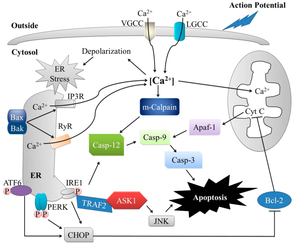 This review focuses on: (a) ER stress and UPR signal transduction pathways; (b) the role of Ca2+ in the ER stress and apoptosis; and (c) the involvement of action potential in ER stress-mediated apoptosis.