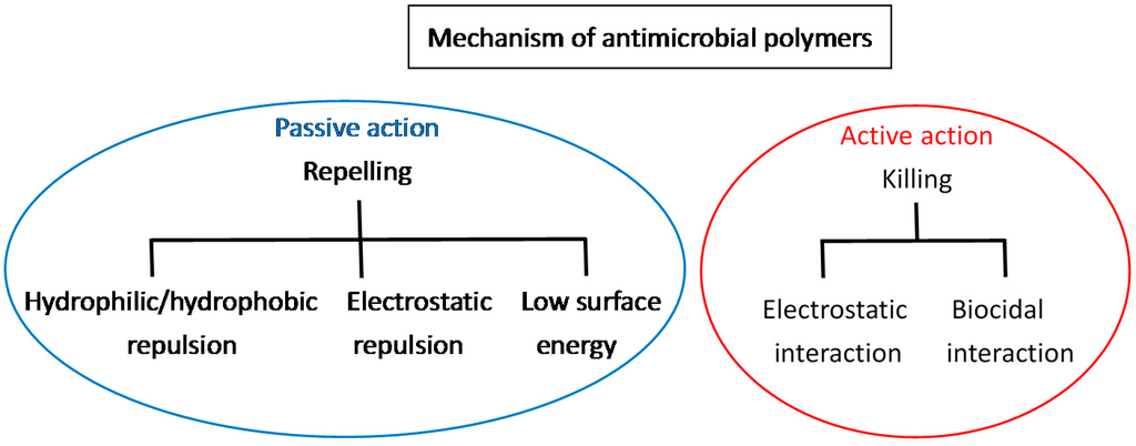 The schematic reaction mechanisms of passive and active action of the antimicrobial polymers.
