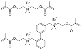 Polymeric biocides are polymers that covalently link bioactive repeating units with antimicrobial activity such as amino, carboxyl, or hydroxyl groups [,,]. The polymerization process may either enhance or reduce the antimicrobial activity of bioactive functional groups. Table 4 lists examples of polymeric biocides synthesized from antimicrobial monomers.
