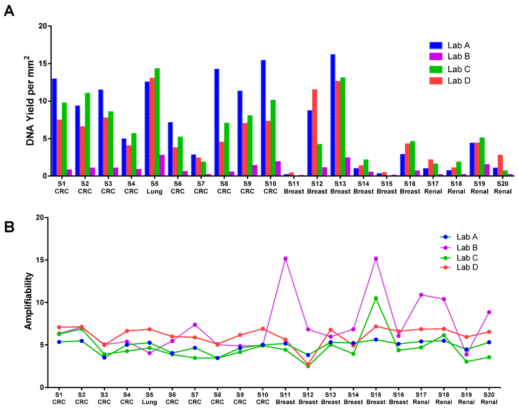 In practice, when choosing a central laboratory or contract research organization (CRO) for NGS or DNA/RNA extraction, it is very critical to benchmark the lab performance using commercial reference samples, such as HorizonDx FFPE cell line curls, or FFPE slides that have been extracted and benchmarked previously. Twenty FFPE blocks (colorectal cancer, renal cell carcinoma, breast cancer, lung cancer) of different ages (ranging from one to five years) were sectioned to 5 µm slides (50 slides for each block). Five slides from each subject were sent to four commercial labs for DNA extraction. Slides were arranged in a way to minimize bias. For example, slides 1, 11, 21, 31, 41 were sent to Lab A, slides 2, 12, 22, 32, 42 were sent to Lab B, and so on. Each lab quantified DNA (both yield and fraction of amplifiable DNA) using its preferred method. Each lab sent the remaining DNA back to us for standardized testing of DNA quantitation and DNA amplifiability.