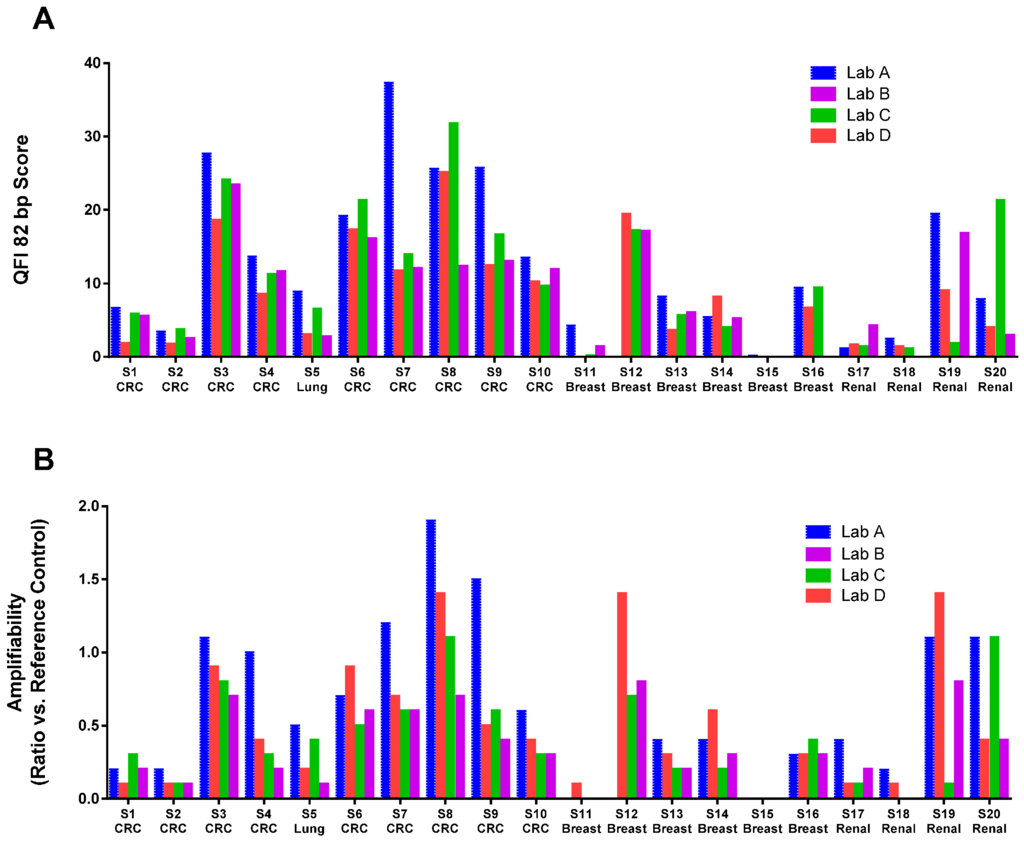 Amplifiability of DNA extracted by different labs measured by Asuragen Quantitative Functional Index (QFI) (A) and RNase P (B) assays. S12 from Lab A was run out and quality control (QC) data is not available. Missing data for S11 is due to poor FFPE block quality and high fat content of the breast tissue. CRC: colorectal cancer.