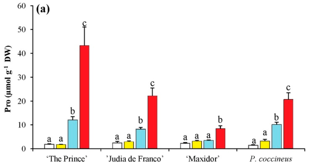- Jiménez-Bremont, J.F.; Becerra-Flora, A.; Hernández-Lucero, E.; Rodríguez-Kessler, M.; Acosta-Gallegos, J.A.; Ramírez Pimentel, J.G. Proline accumulation in two bean cultivars under salt stress and the effect of polyamines and ornithine. Biol. Plant. 2006, 50, 763–766. [Google Scholar] [CrossRef]