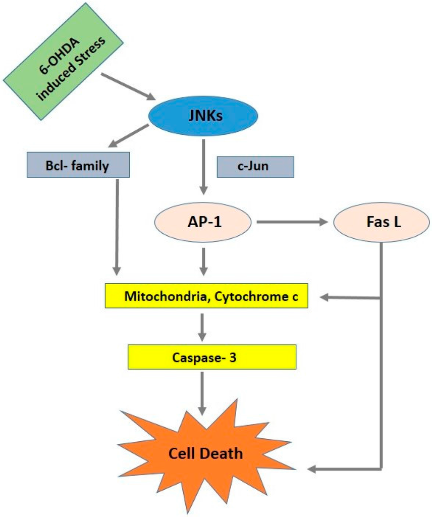 In response to various stressors, c-Jun N-terminal kinase (JNK) is activated and phosphorylates c-Jun, which increases the activity of activating protein-1 (AP-1). AP-1 modulates the transcription genes such as Fas ligand (FasL) to induce apoptosis via an extrinsic pathway. JNK also appears to activate non-nuclear substrates (such as Bcl-2 family members) to promote cell death via an intrinsic pathway. 6-OHDA: 6-hydroxydopamine.