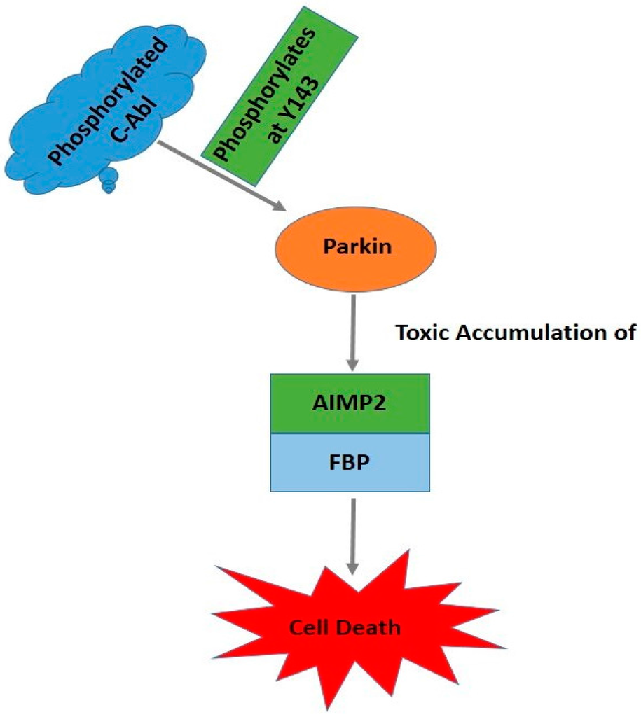 Phosphorylated c-Abl tyrosine phosphorylates parkin at Y143, which leads to the loss of ubiquitin-ligase activity, the accumulation of toxic parkin substrates, and neuronal death. AIMP2: aminoacyl tRNA synthetase complex-interacting multifunctional protein 2; FBP: far up stream element binding protein.