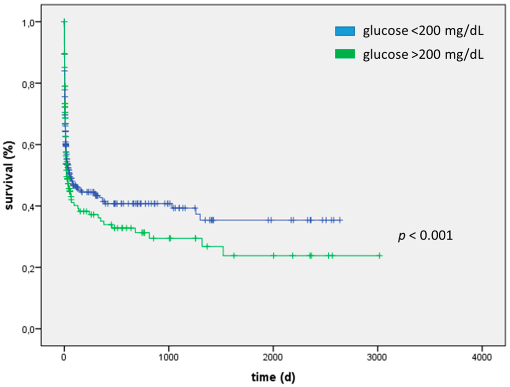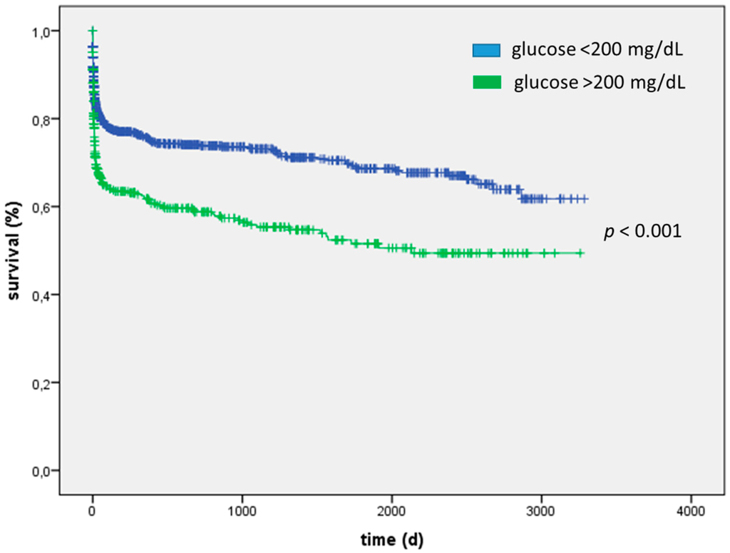 In the overall population severe hyperglycemia (>200 mg/dL) was associated with increased mortality in the long-term (HR 1.74, 95% CI: 1.44–2.09; p < 0.001).