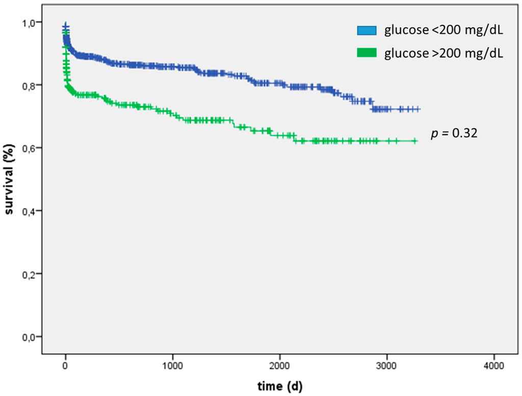 In septic patients severe hyperglycemia (blood glucose >200 mg/dL) but not mild hyperglycemia (141–199 mg/dL) was recently reported to be associated with increased mortality []. Up to a certain degree, stress hyperglycemia is thought to be adaptive to hemodynamic changes in patients suffering from sepsis []: Sufficient glucose supply is essential for all cells. As sepsis leads to hypo-perfusion and glucose uptake depends on a concentration gradient, an increase in blood glucose levels is a physiologic and necessary response mechanism to hypo-perfusion []. Whereas in the early 2000s tight glucose control in septic patients was thought to be beneficial, it could be shown in large, prospective trials that intensive glucose control is even detrimental for these patients [,,]. Therefore, in septic patients, stress hyperglycemia is considered a beneficial response of the organism and only liberal management of high glucose, avoiding glucose concentrations leading to fluid shifts by serum osmolality changes, is recommended []. It is well known that patients suffering from diabetes are at increased risk for infection and sepsis due to humoral defects and impaired host response [,,]. Even though, and in contrast to AMI patients, septic patients with known diabetes mellitus do not reveal increased mortality as reported by van Vught et al. and Esper et al. [,].