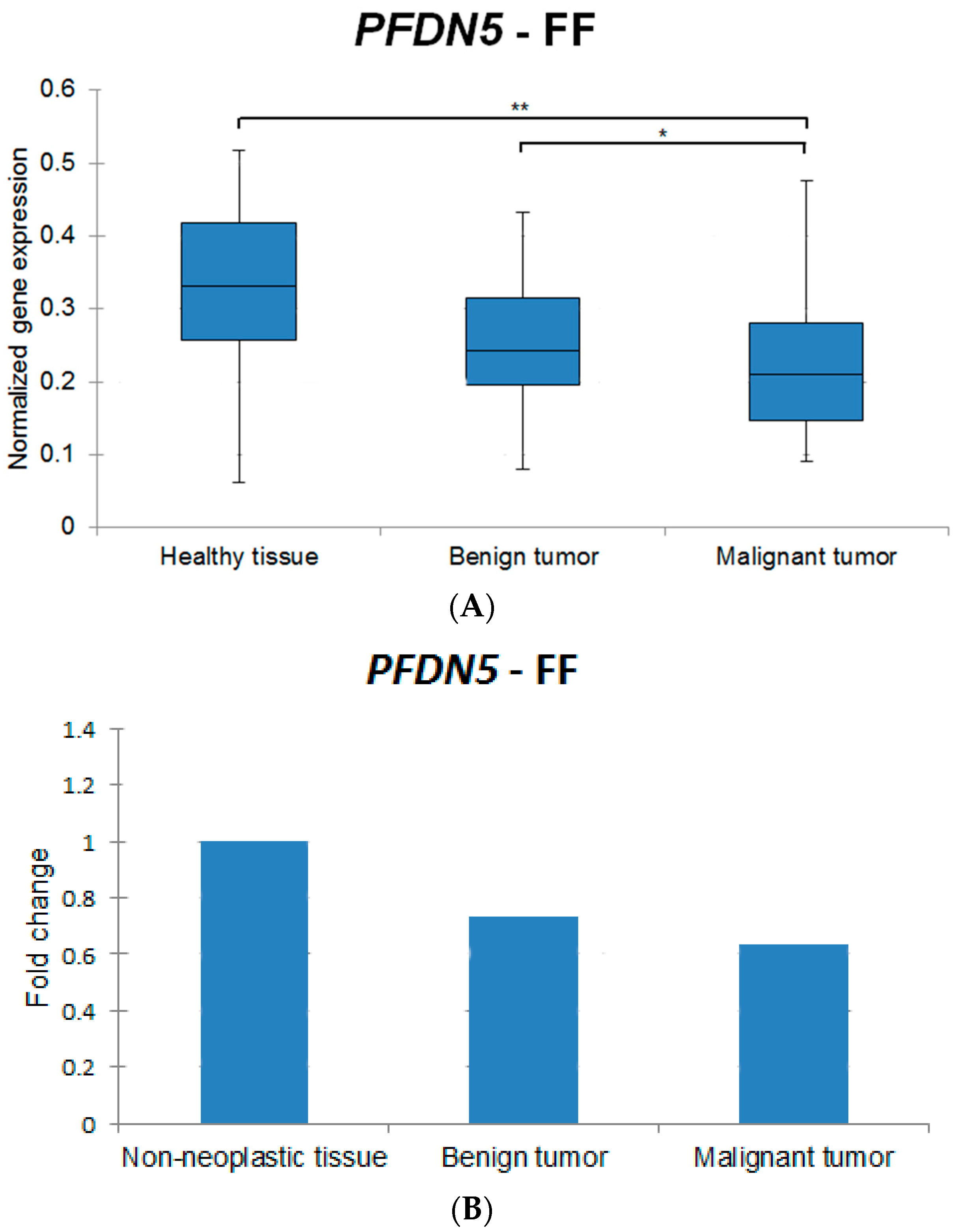 Exemplary graphs representing the percentage change of PFDN5 between the histologic groups in FF and FFPE are represented in Figure 1B and Figure 2B, respectively.