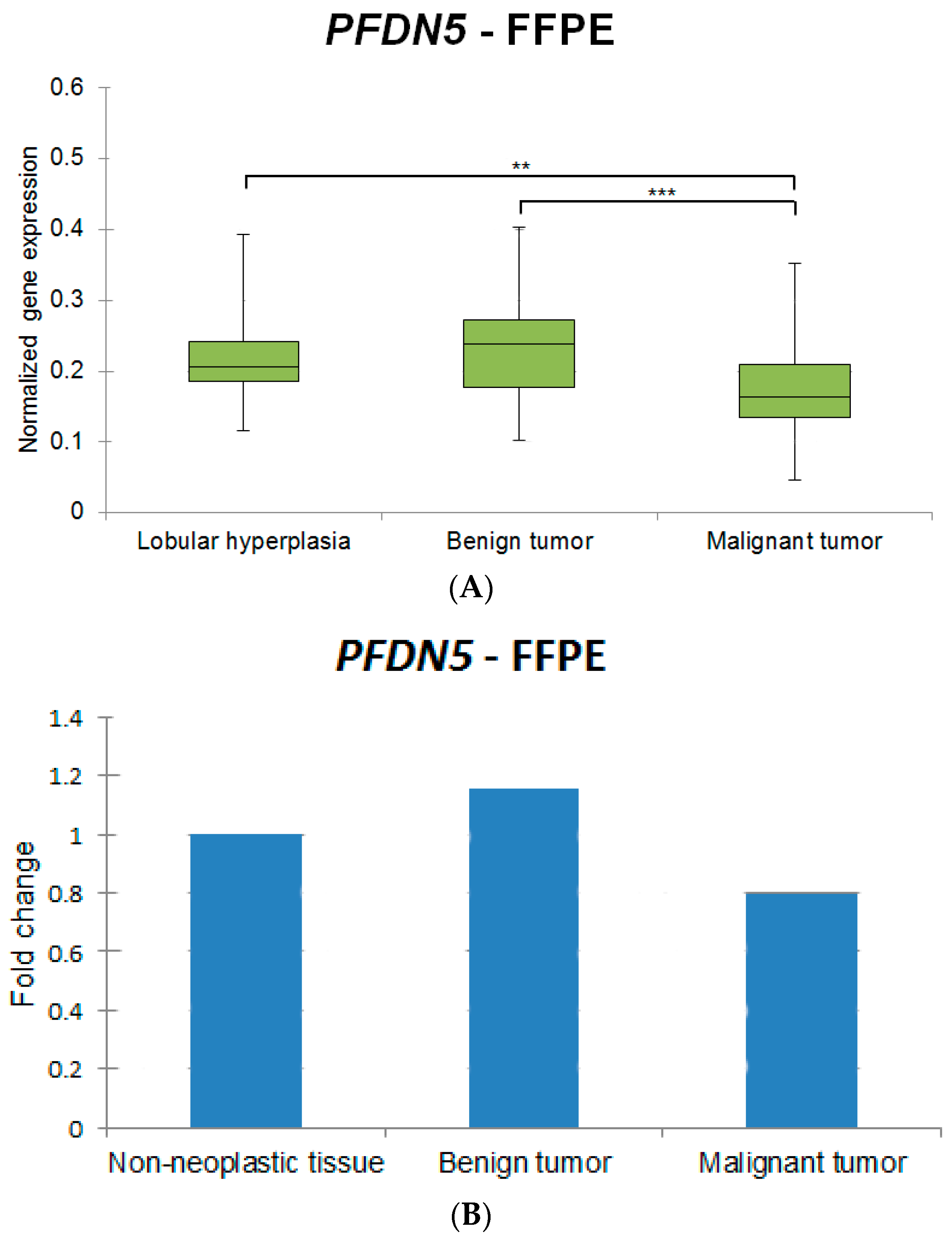 (A) Exemplary box plot indicating the normalized gene expression of PFDN5 in formalin-fixed, paraffin-embedded samples in the different histologic groups. Statistically significant differences are indicated by an asterisk (*). Results are classified as very significant (** p < 0.01) and extremely significant (*** p < 0.001). The box includes cases from the 25th to the 75th percentile. The horizontal line within the box represents the median and the upper and lower bars are the largest and lowest observed values. Significant differences are revealed between the groups lobular hyperplasias vs. malignant tumors and benign tumors vs. malignant tumors. A lower level of expression can be clearly identified when comparing the expression of PFDN5 in fresh frozen samples (Figure 1); (B). Normalized expression fold changes (mean) indicating the percentage change of PFDN5 in formalin-fixed, paraffin-embedded samples in the different histologic groups.