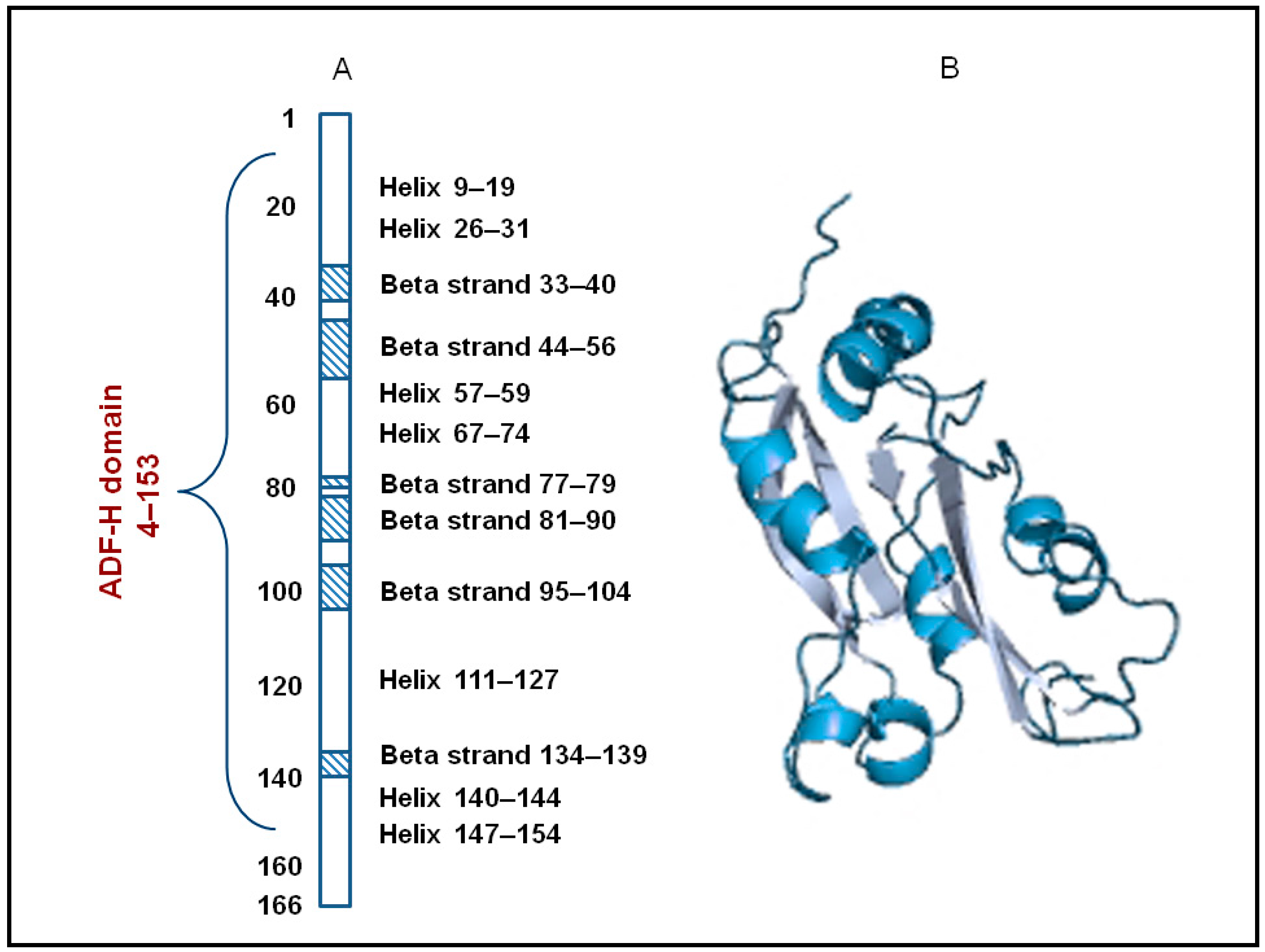 | Destrin, DSTN (P60981) | 164 * (2–165) | ADF-H, 150 (4–153) | Nuclear localization signal | F- and G-actin (actin depolymerization and polymerization), PIP2 |
