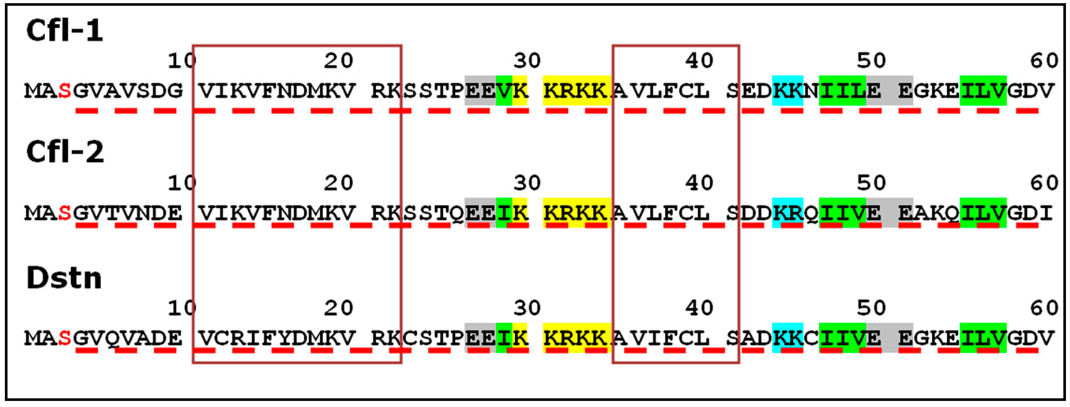 - Goroncy, A.K.; Koshiba, S.; Tochio, N.; Tomizawa, T.; Sato, M.; Inoue, M.; Watanabe, S.; Hayashizaki, Y.; Tanaka, A.; Kigawa, T.; et al. NMR solution structures of actin depolymerizing factor homology domains. Protein Sci. 2009, 18, 2384–2392. [Google Scholar] [CrossRef] [PubMed]