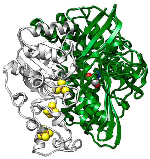 While the involvement of a glutamate residue in proximity to one of the terminal cysteine residues has been established as a gateway for proton transfer, see [2] for recent spectroscopic and [3] for structural evidence, the routes for electron transfer are less studied. The arrangement of three FeS-cluster in the small subunit, however, suggests the flow of electrons along these metallic cofactors (see Figure 1). The electron transfer path of the [NiFe]-hydrogenase in the small subunit is made up of aligned iron–sulfur clusters, the proximal [4Fe–4S]-, the medial [3Fe–4S]-, and the distal [4Fe–4S]-cluster, which can be characterized by protein film voltammetry, see [4,5] for review articles.